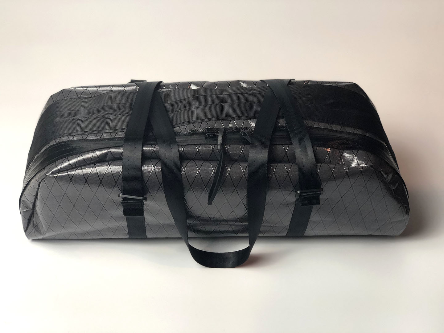 Hyper-light small duffle with tape-side-out aqua guard zipper. Full bag length strip of tecsys offers expansion slots. Built with x10 xpac, this bag offers ultra-light, highly abrasion and water resistant properties.